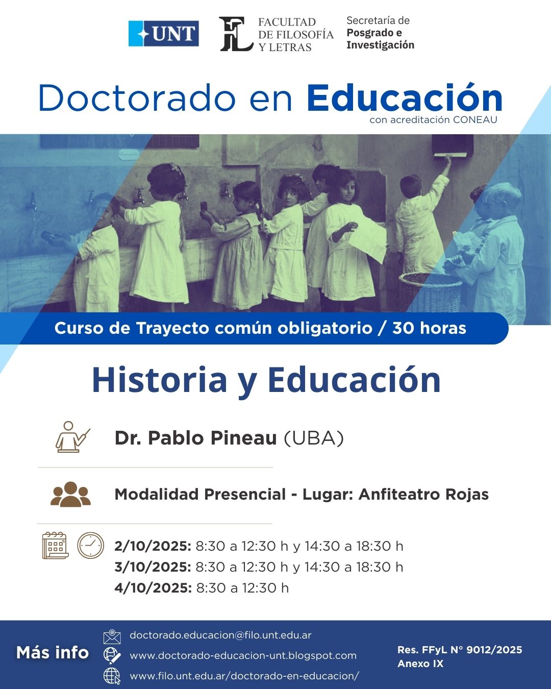 El Doctorado en Educación de la Facultad de Filosofía y Letras invita a doctorandas/os e interesados/as a participar del curso de trayecto común obligatorio “Historia y Educación”, dictado por el Dr. Pablo Pineau (UBA).