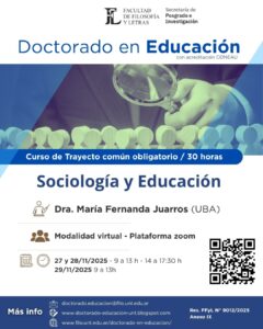 El Doctorado en Educación de la Facultad de Filosofía y Letras invita a doctorandas/os e interesados/as a participar del curso de trayecto común obligatorio “Sociología y Educación”, dictado por la Dra. María Fernanda Juarros (UBA)