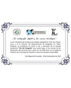 La Sra. Directora del Instituto de Estudios Geográficos, Prof. Ana Teresa Cusa, y el Sr. Director del Departamento de Geografía, Dr. Pablo Paolasso, se complacen en invitar a Ud. a participar de la Jornada Académica "Día del Geógrafo" que tendrá lugar el día viernes 28 de Noviembre del corriente año a partir de las 9:00 horas en el Auditorio Prebisch de la Facultad de Filosofía y Letras (Av. Benjamín Aráoz 800)