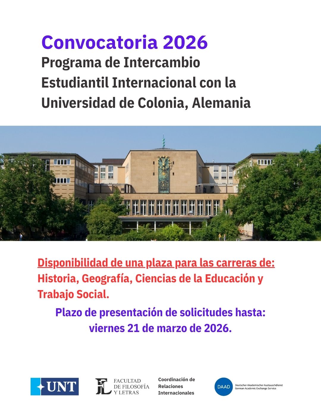Disponibilidad de una plaza para las carreras de: Historia, Geografía, Ciencias de la Educación y Trabajo Social.