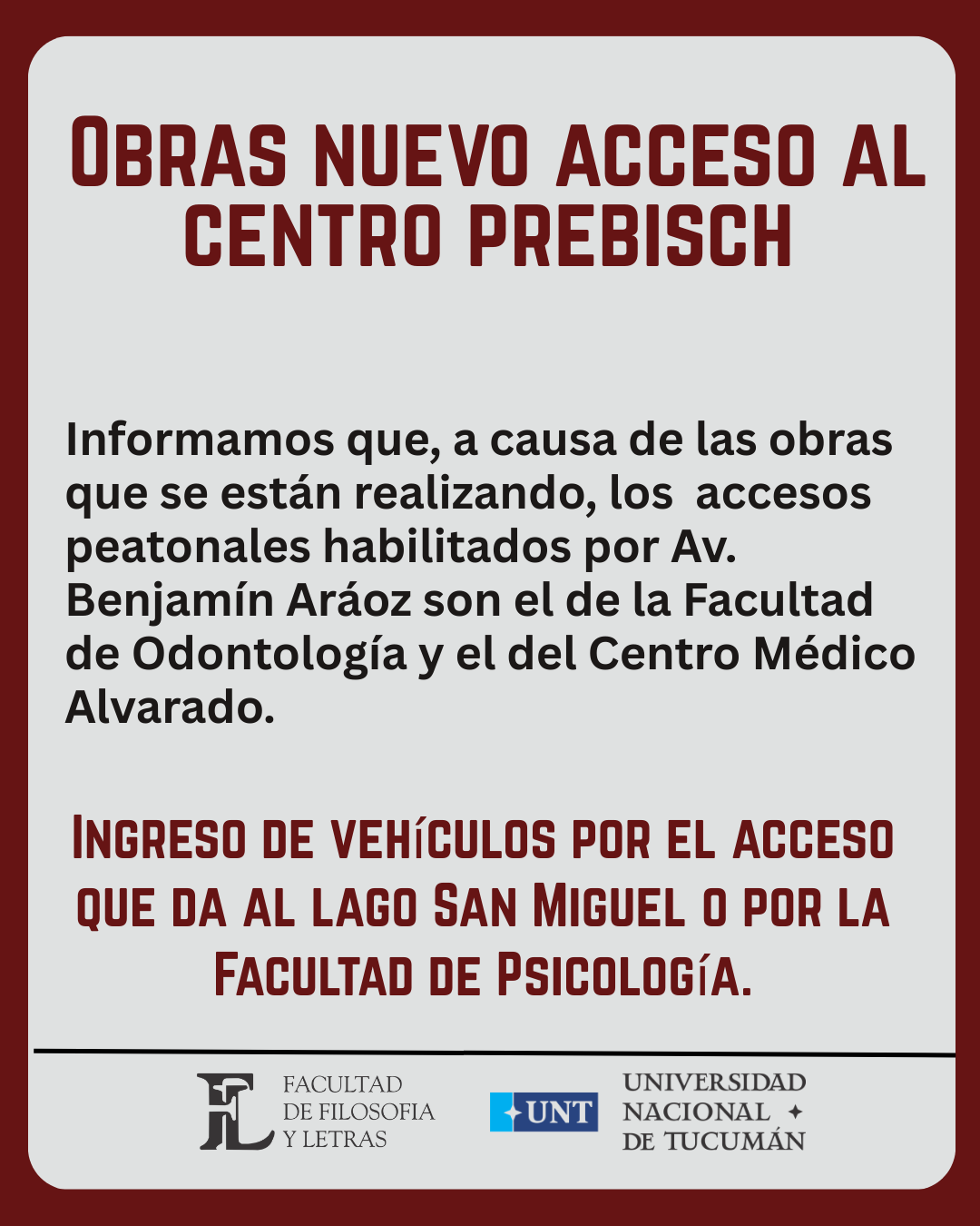 Informamos que, a causa de las obras que se están realizando, los accesos peatonales habilitados por Av. Benjamín Aráoz son el de la Facultad de Odontología y el del Centro Médico Alvarado.