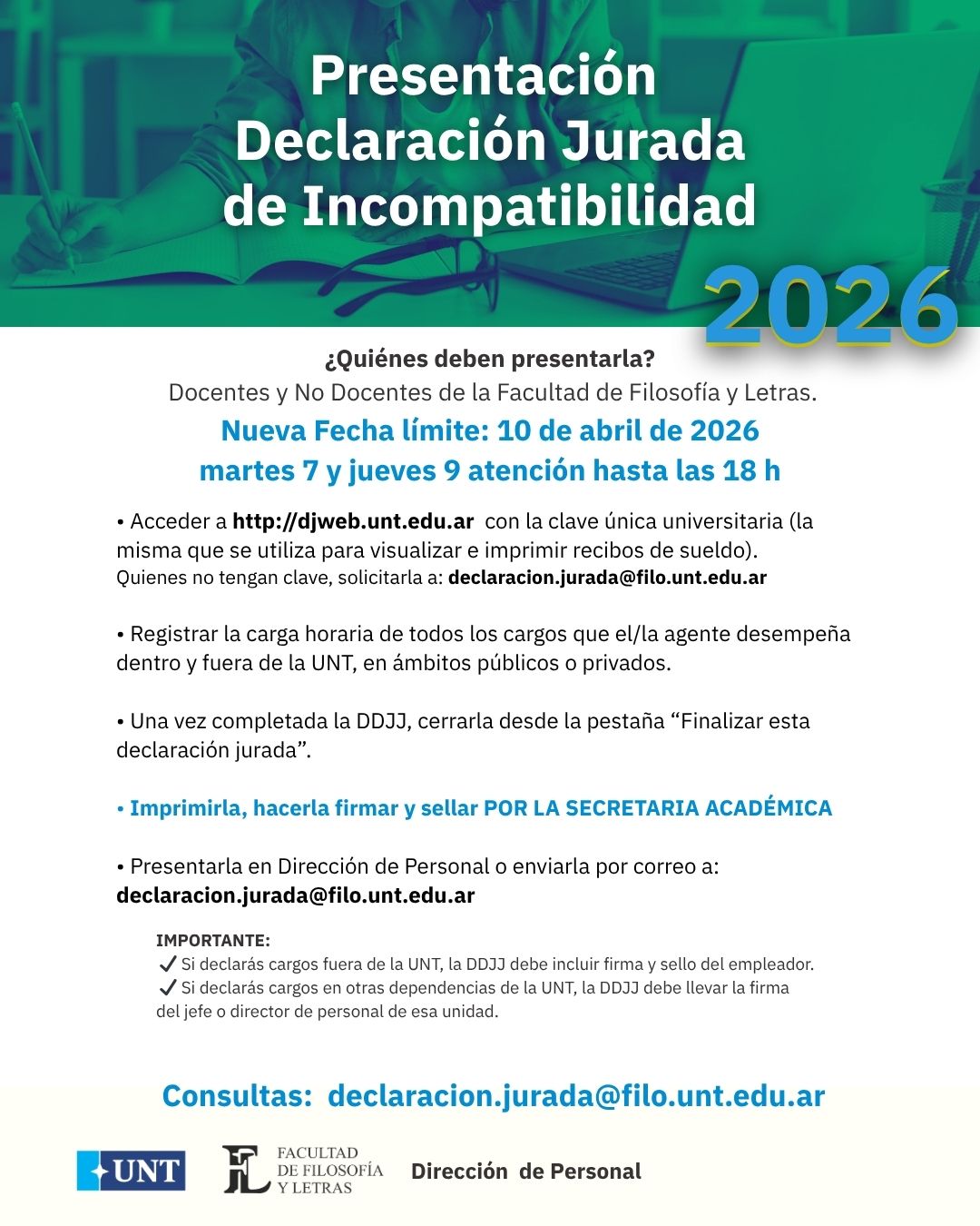 La Dirección de Personal recuerda a Docentes y No Docentes de Filosofía y Letras que deben realizar la presentación de la "Declaración Jurada de Incompatibilidad". Se recuerda también la obligatoriedad de presentación de la Declaración Jurada de Incompatibilidad Anual Web al producirse un movimiento en el cargo.