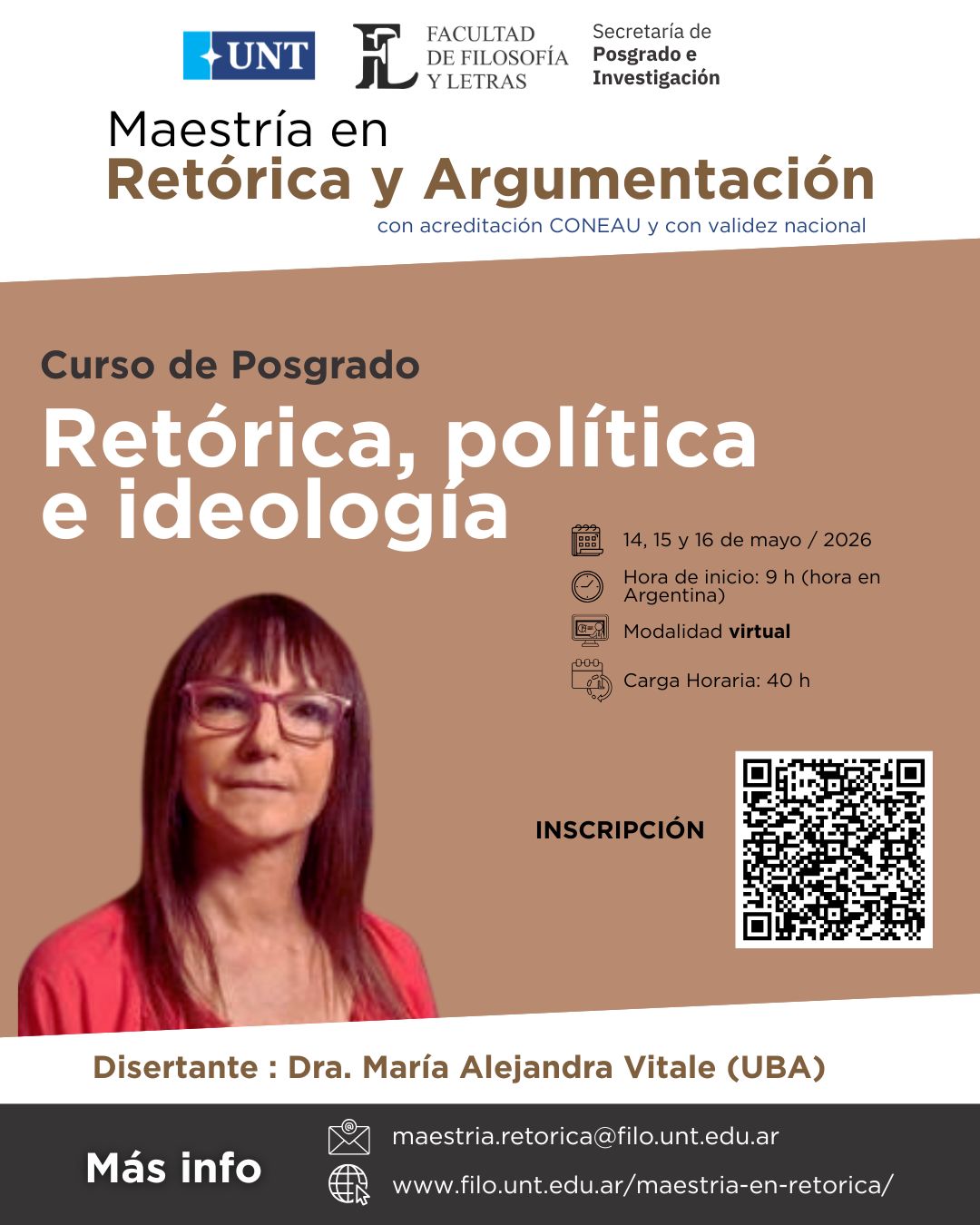 La Maestría en Retórica y Argumentación invita al Curso de posgrado "Retórica, política e ideología" a cargo de la Dra. María Alejandra Vitale (UBA)