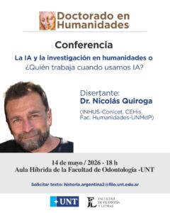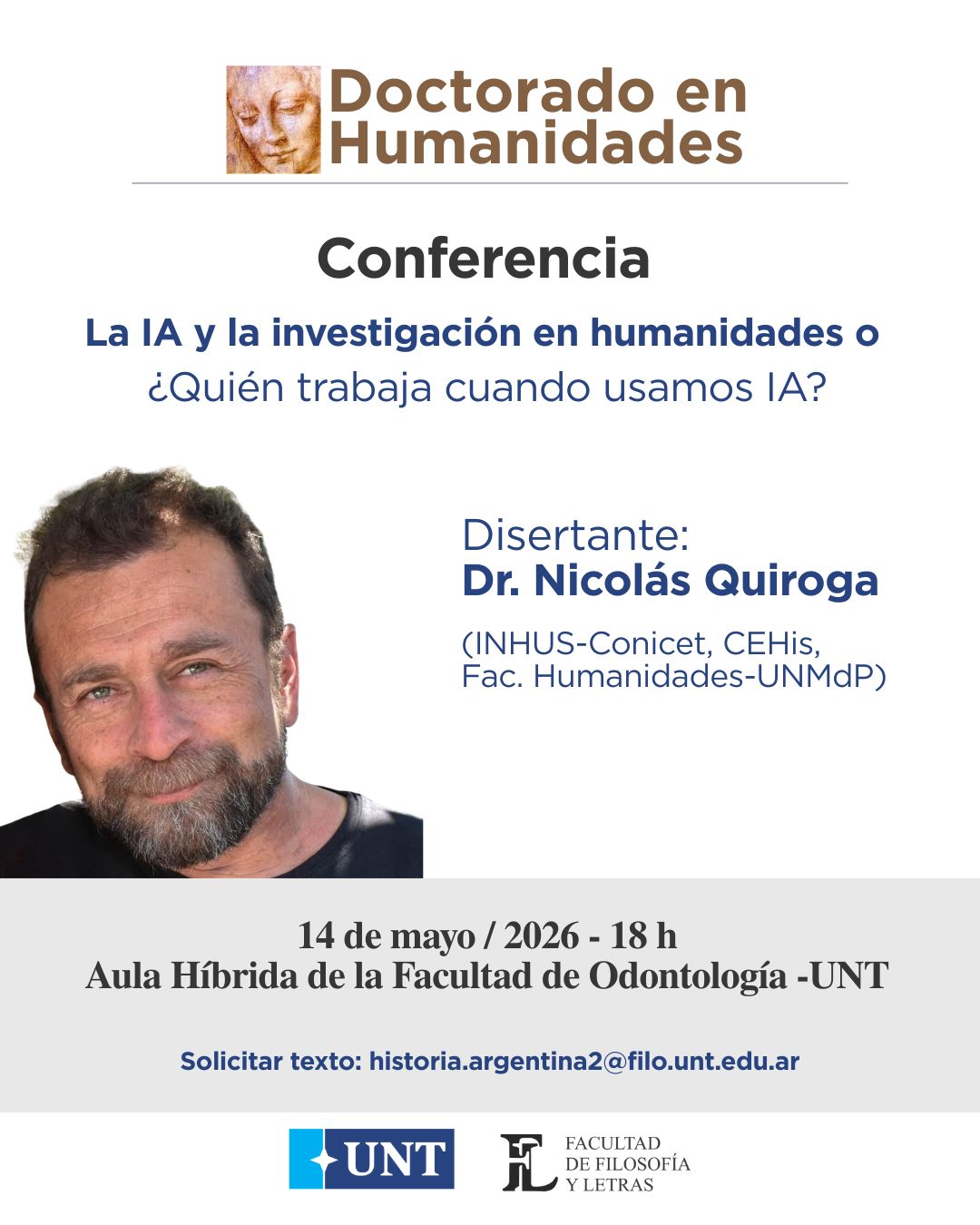 El Doctorado en Humanidades invita a la Conferencia "La IA y la investigación en humanidades o ¿Quién trabaja cuando usamos IA?" que ofrecerá el Dr. Nicolás Francisco Quiroga (INHUS-Conicet, CEHis, Fac. Humanidades-UNMdP)