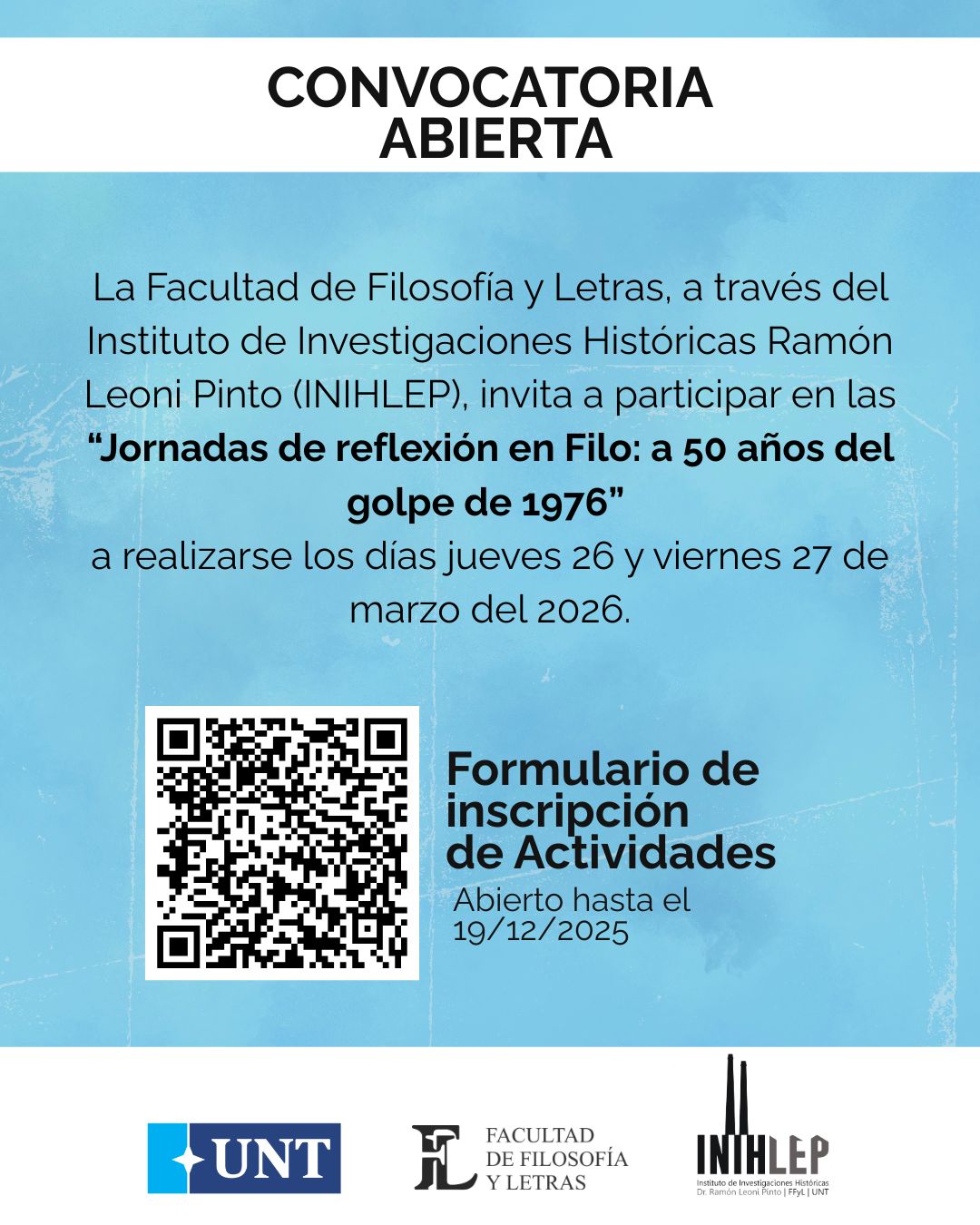 La Facultad de Filosofía y Letras, a través del Instituto de Investigaciones Históricas Ramón Leoni Pinto (INIHLEP), invita a participar en las "Jornadas de reflexión en Filo: a 50 años del golpe de 1976" a realizarse los días jueves 26 y viernes 27 de marzo del 2026.